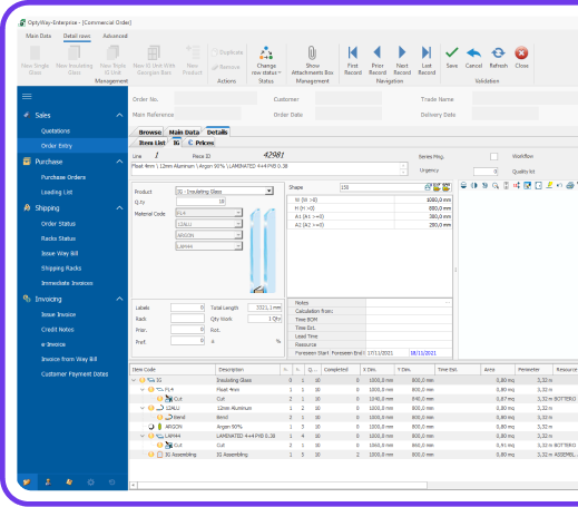 Optima da oltre 30 anni realizza soluzioni verticali specificatamente pensate per la gestione della vetreria con una completa ottimizzazione dei processi ed un’integrazione ottimale delle macchine per la lavorazione del vetro piano. Enterprise è un ERP \ MES verticale e consente una gestione dell’intero ciclo produttivo del prodotto in maniera semplice ed estremamente efficace. La verticalità sul mondo del vetro lo rende il miglior programma per la gestione di ordini, con gestione di sagome parametriche e CAD\CAM integrato nella distinta base e cicli di produzione con un order entry specifico e di estrema efficacia, oltre che semplice da utilizzare. Con Enterprise le composizioni richieste dal cliente vengono inserite direttamente nel menu ordini senza necessità di creare articoli, distinte o elementi specifici per ogni prodotto come avviene con gli ERP di uso generico. Il programma calcola in automatico il prezzo di vendita, e per ogni fase i tempi di lavorazione, assegna le macchine, invia e riceve dati di produzione.